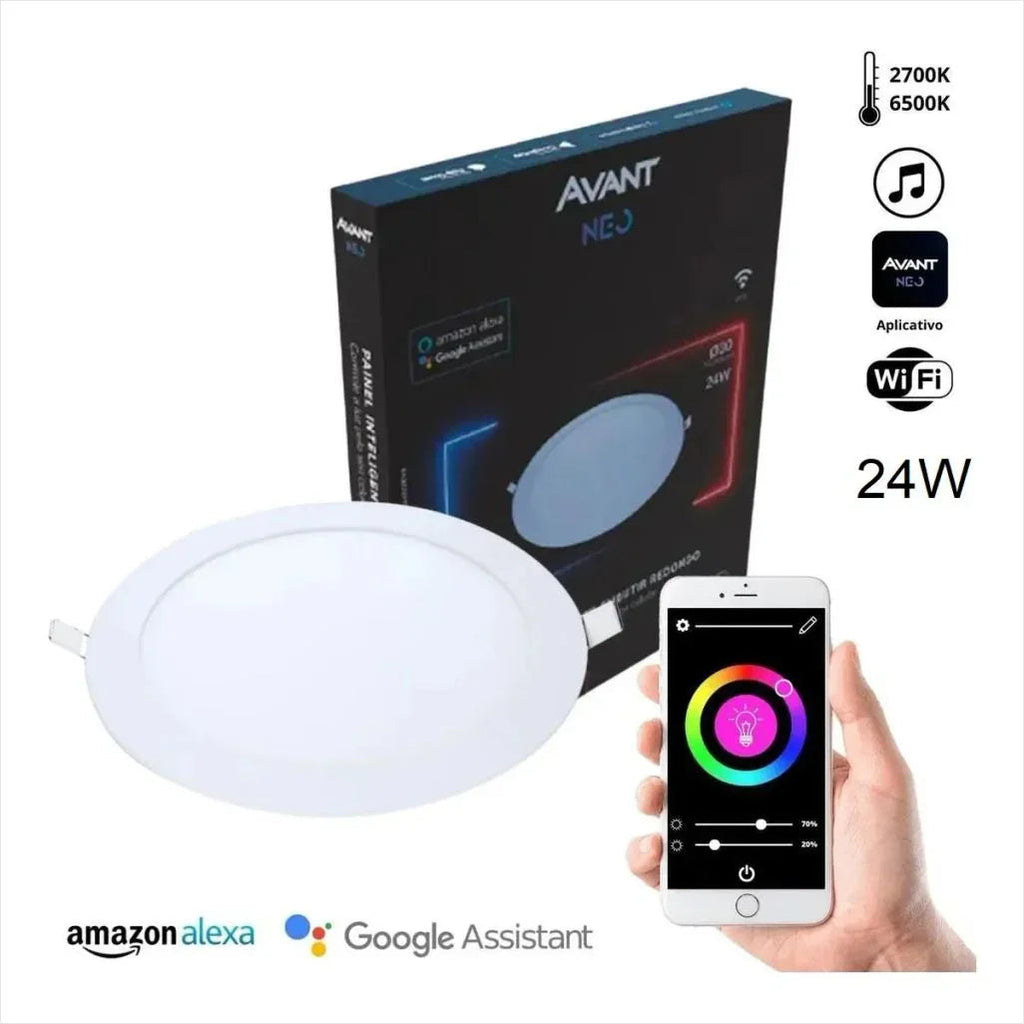 Ilumine seus ambientes com o Spot Avant Painel Neo Sobrepor Redondo, oferecendo versatilidade de cores de luz (2700K e 6500K) e alta eficiência energética de 24W em um design moderno e de fácil instalação.